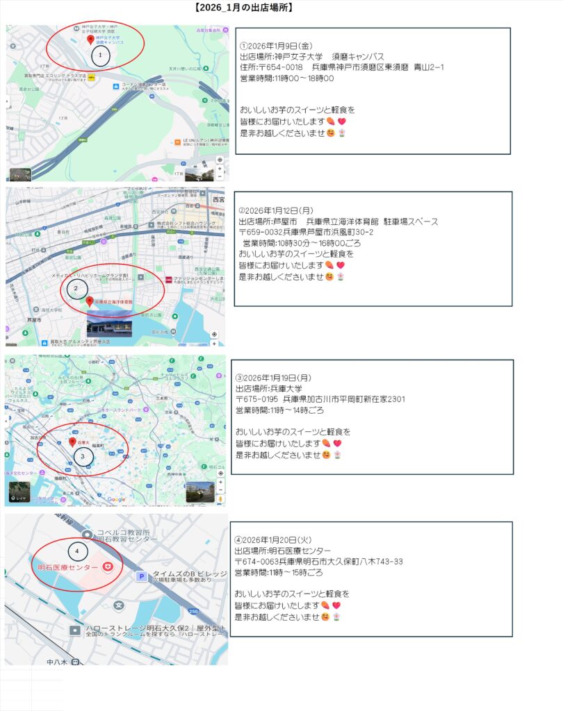 【2026年 1月の出店場所】 ホーム20261月5 タグ: 未分類 2026-01-05 0 コメントを残す コメントをキャンセルメールアドレスが公開されることはありません。 ※ が付いている欄は必須項目ですコメント ※ 名前 ※ メール ※ サイト 次回のコメントで使用するためブラウザーに自分の名前、メールアドレス、サイトを保存する。 投稿者 hujimoto.isao@opal.plala.or.jp Hoku Hoku Happy 代表 ISAO FUJIMOTO Email: fujiisa641@gmail.com 関連投稿 タグ: 未分類 新年あけましておめでとうございます! 2026-01-01 0 すべて読む タグ: 未分類 【12月の出店場所について】 2025-11-19 0 すべて読む タグ: 未分類 【11月の出店場所について】 2025-11-01 0 すべて読む タグ: 未分類 【10月の出店場所】 2025-10-02 0 すべて読む タグ: 未分類 9月7日以降~10月はじめまで、営業は 一時中止!キッチンカーリニューアルのため!よろしくお願いします! 2025-09-10 0 すべて読む タグ: 未分類 【9月の出店場所】 2025-08-25 0 【9月の出店場所】 ... すべて読む 投稿ナビゲーション 前の投稿